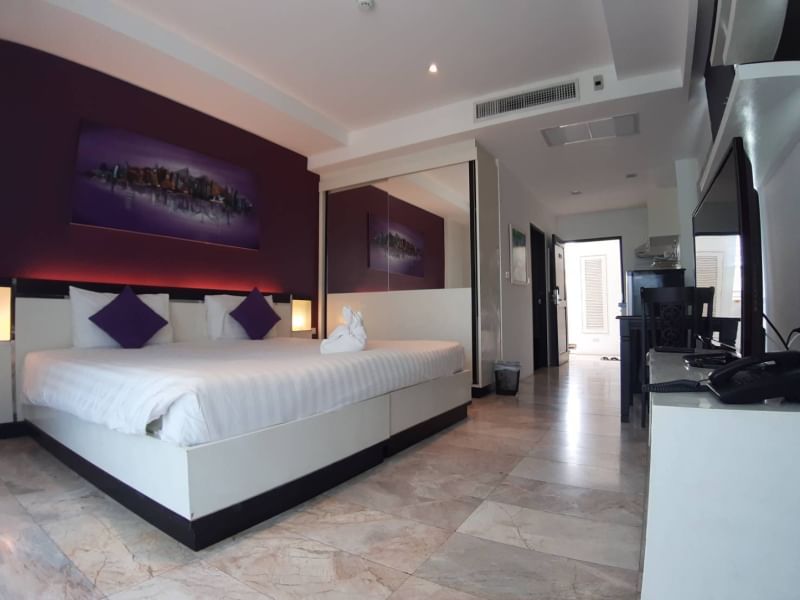1 bedroom, 1 bathroom, 40 square meter, corner room sea view, built in furniture, aircon, kitchen, TV, refrigerators.